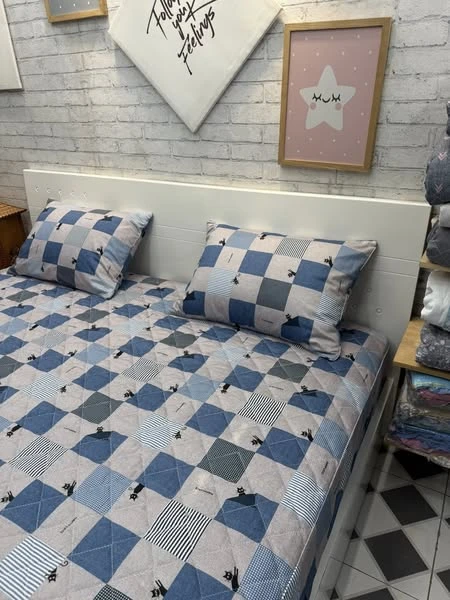 Bộ chăn ga gối caro xanh họa tiết chú mèo Hàn Quốc