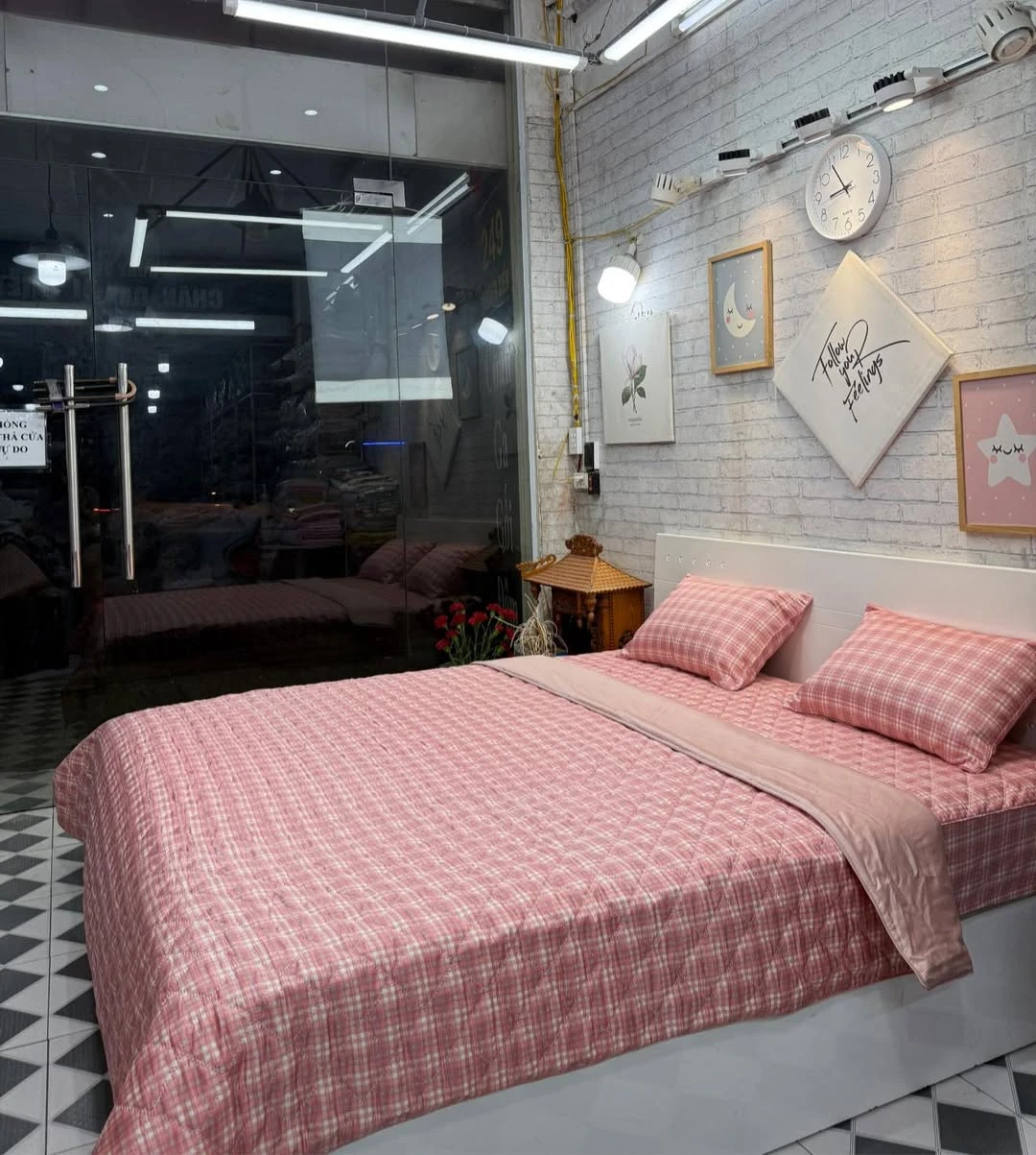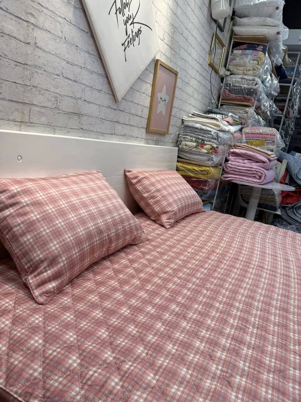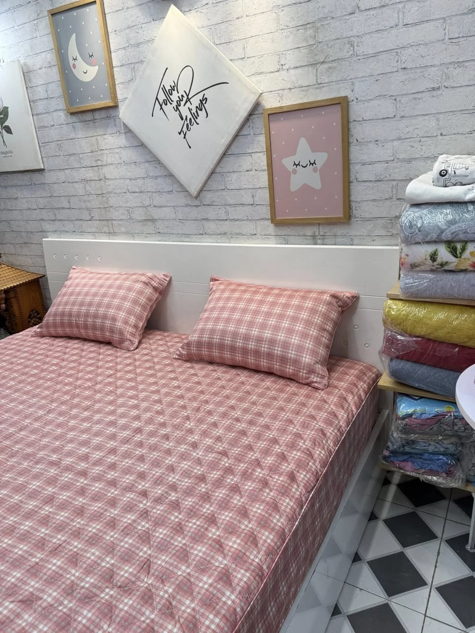 Bộ chăn ga gối cotton Hàn Quốc caro hồng cam xjnh lắm ah