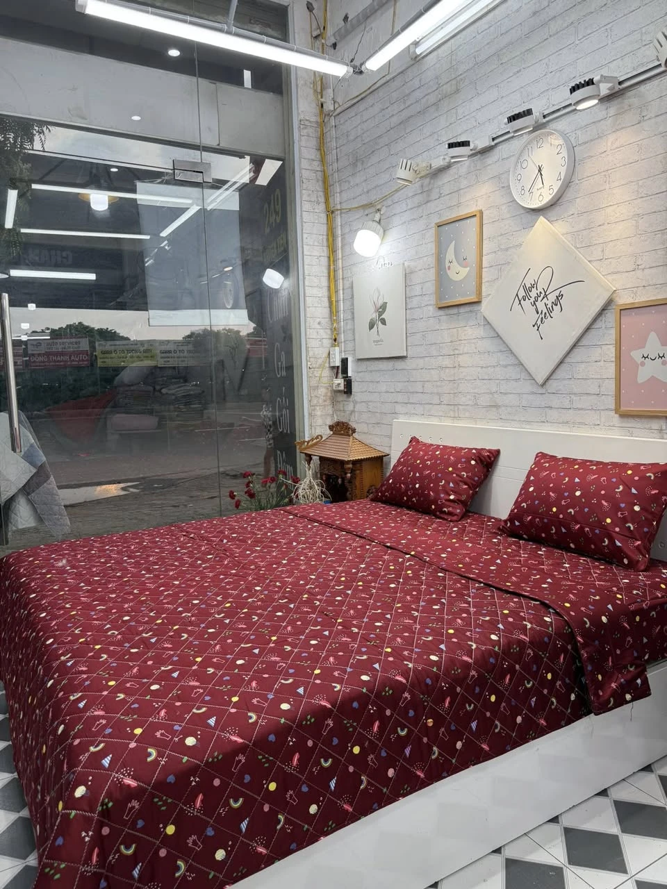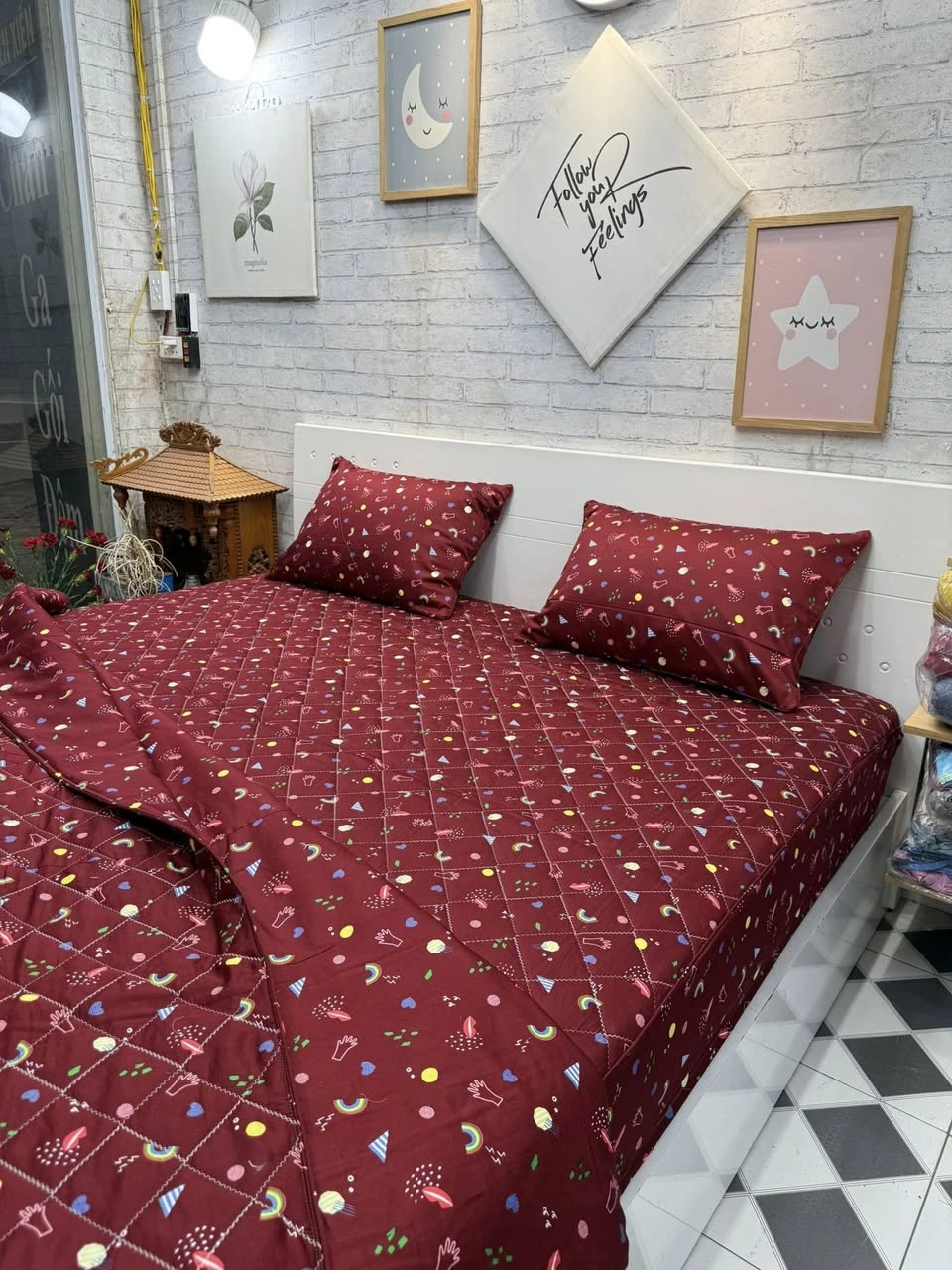 Bộ chăn ga gối cotton Hàn Quốc Hoạ tiết đỏ xjnh xắn lắm ah.