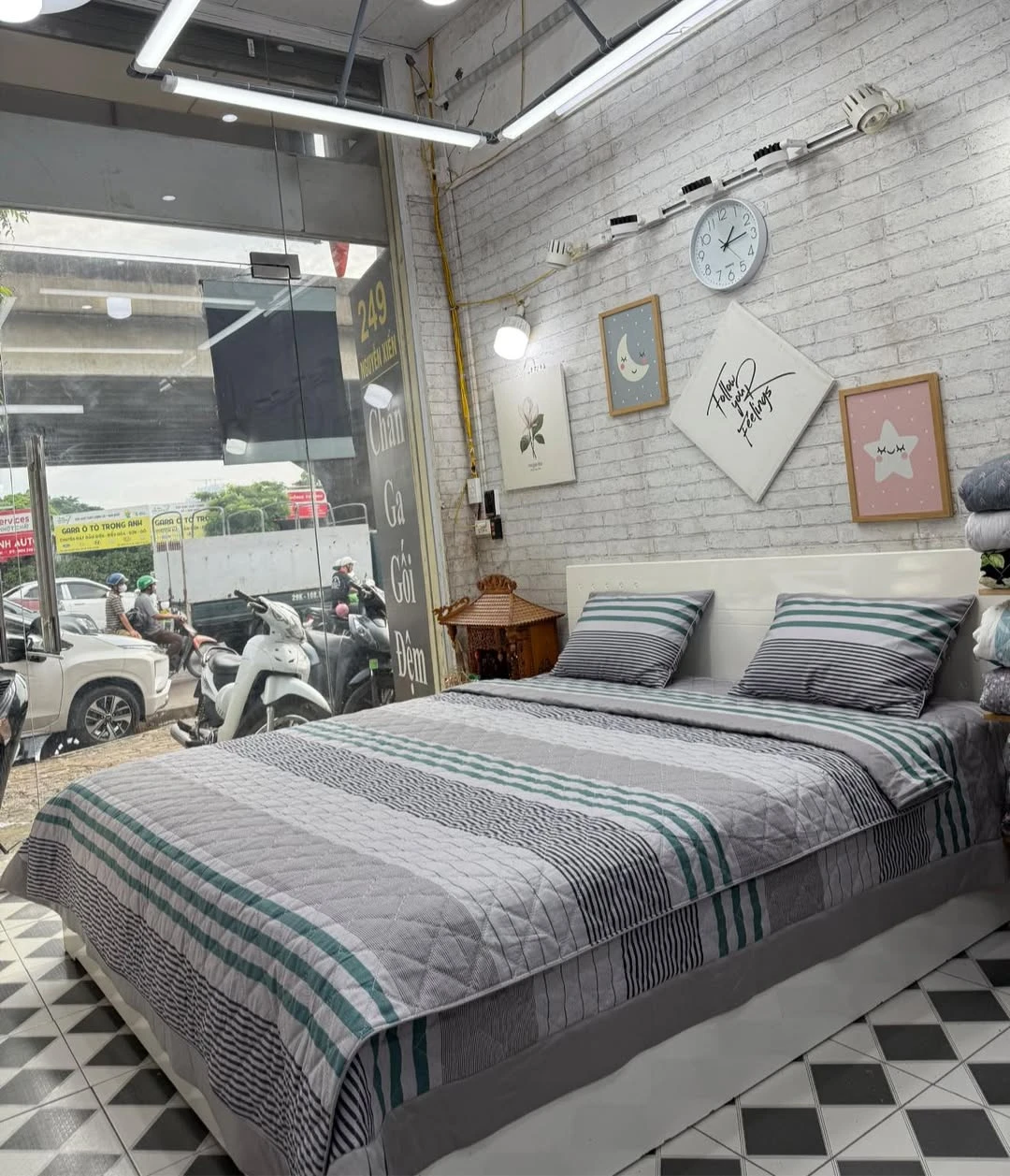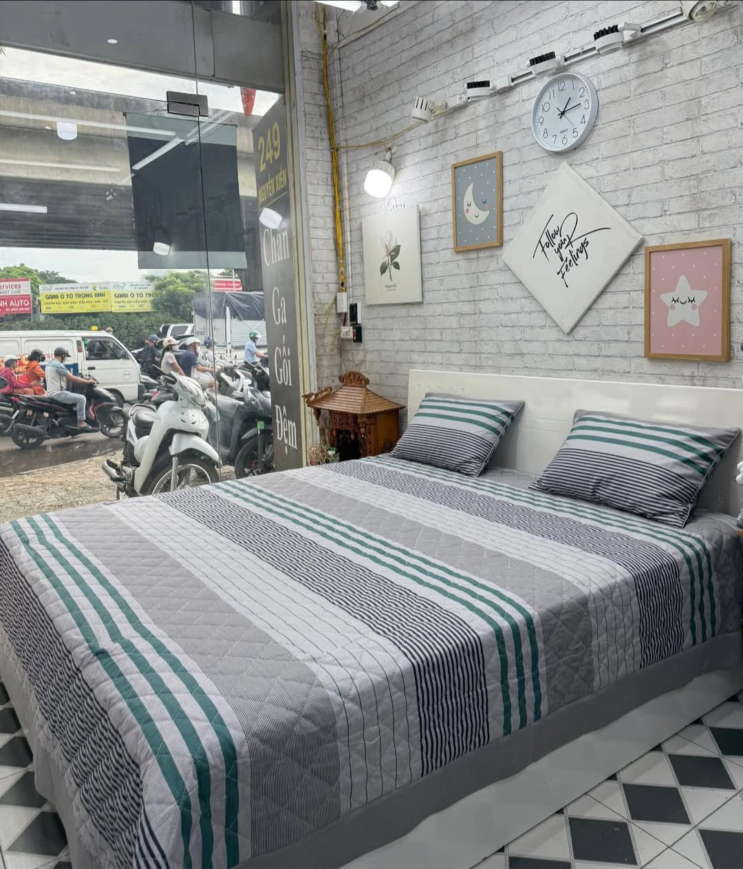 Bộ chăn ga gối cotton Hàn Quốc kẻ xanh ghi cá tính