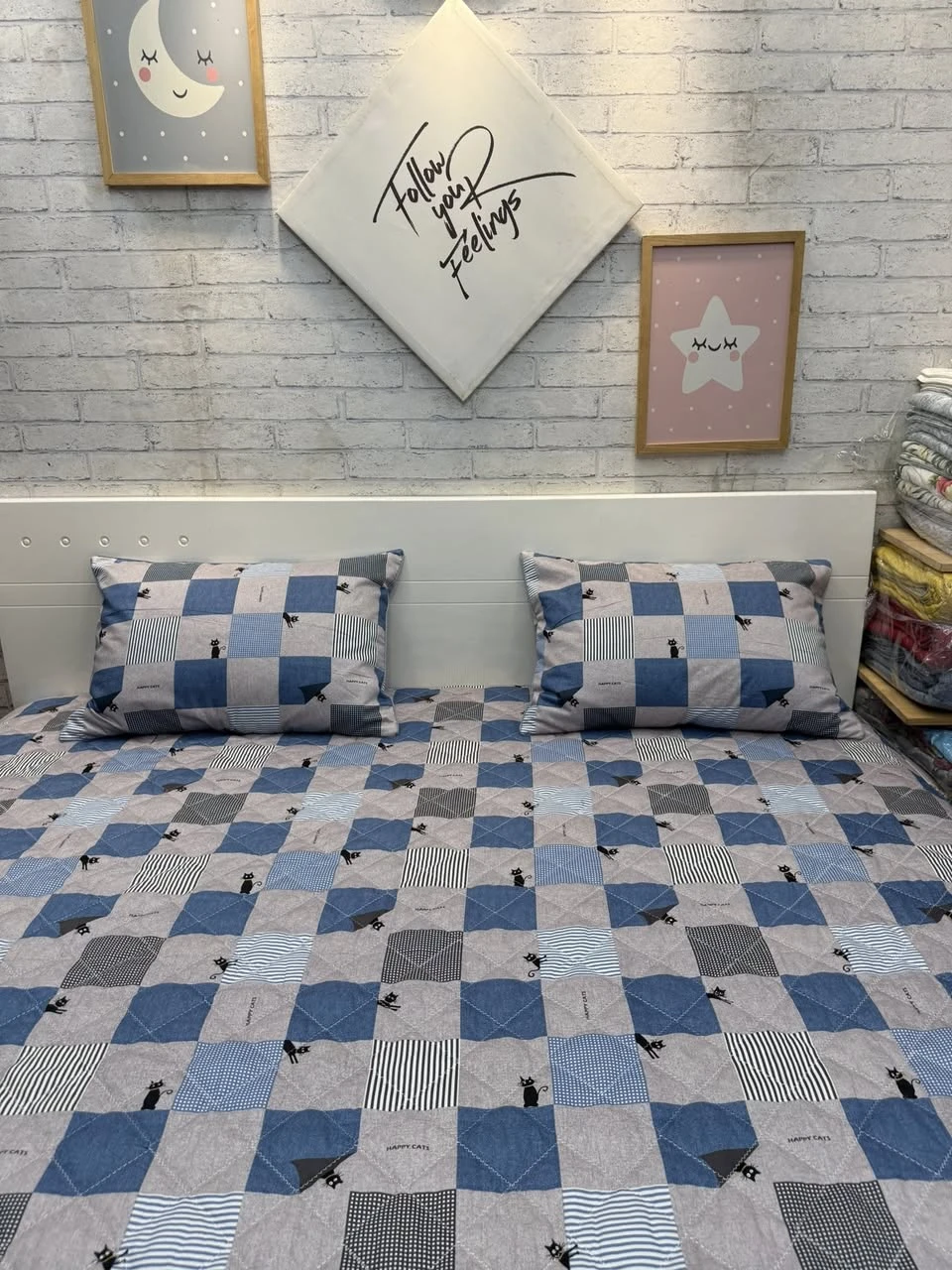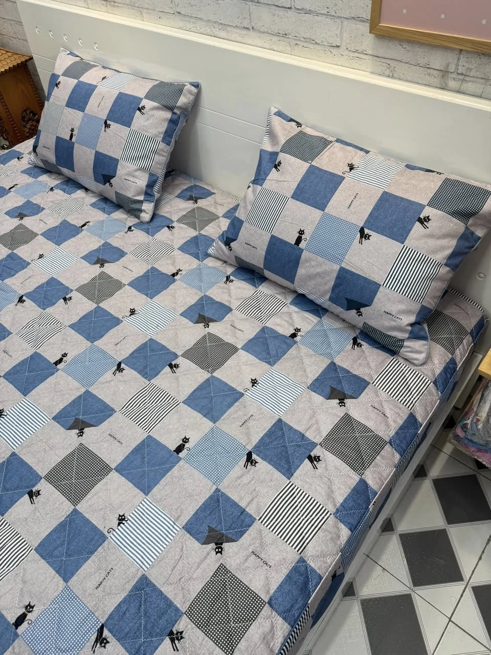 Bộ chăn ga gối cotton Hàn Quốc mẫu Happy cats caro xjnh xắn lắm luôn