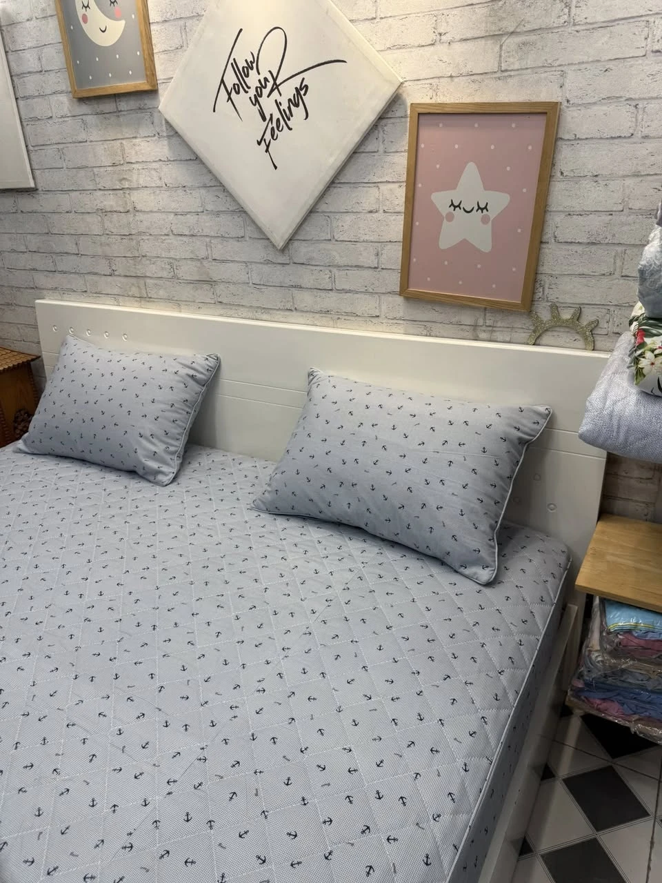 Bộ chăn ga gối cotton Hàn Quốc Mỏ neo ghi xanh xjnh lắm ạ.
