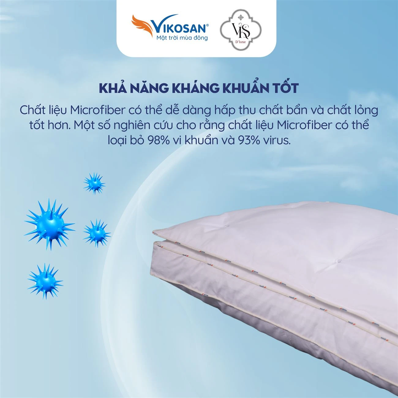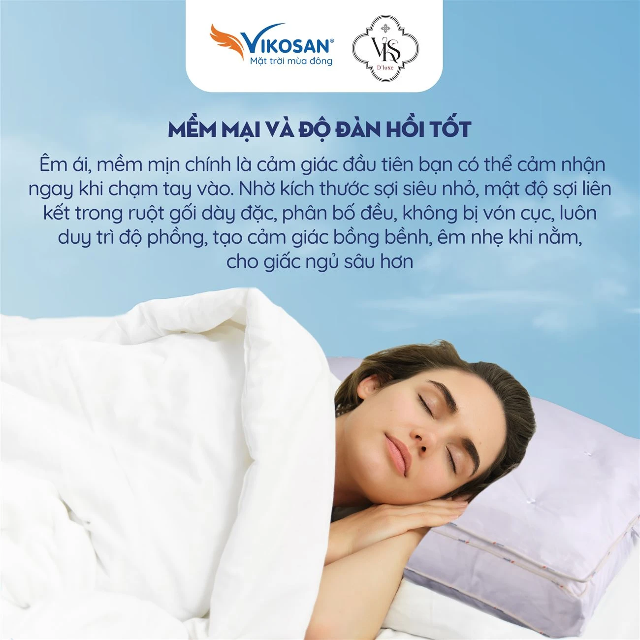 Ruột gối đầu Vikosan với chất liệu vỏ từ 100% cotton với mật độ vải cao, ruột gối được làm từ nguyên liệu bông Microfiber cao cấp, nhiều hạt bông siêu mềm, mịn cho bạn cảm giác dễ chịu, thông thoáng vùng tiếp xúc. Gối êm ái nhẹ như mây. Đặc biệt, sản phẩm vẫn giữ được nguyên hình dạng ban đầu sau thời gian dài sử dụng. Gối mềm siêu êm nâng đỡ phần cổ của bạn giúp giảm tình trạng đau mỏi cổ vai gáy.